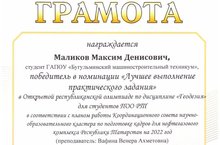 6 мая 2022 года в соответствии с планом работы Координационного совета научно-образовательного кластера по подготовке кадров для нефтегазового комплекса Республики Татарстан на 2022 год на базе ГАПОУ "Лениногорский нефтяной техникум" состоялась олимпиада среди студентов ПОО РТ по дисциплине «Геодезия». Студенты нашего техникума Маликов Максим, Мальцева Анастасия, Чернова Эвелина и Николаев Антон (020гр.), под руководством Вафиной Венеры Ахметовны, приняли участие в олимпиаде. Маликов Максим стал призером в номинации "Лучшее выполнение практического задания".