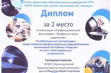 Студентки 116-и группы Данилова Дарья и Галимова Амалия (руководитель Жакупова М.Г.) приняли участие в Республиканском фотоконкурсе среди студентов профессиональных образовательных организаций Республики Татарстан «Моя профессия» в номинации «Профессия моих родителей». Галимова Амалия стала призером конкурса и заняла 2 место. Поздравляем!