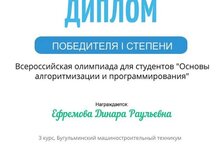 Студентка 937 группы Ефремова Динара стала победительницей во Всероссийской олимпиаде для студентов "Основы алгоритмизации и программирования"
