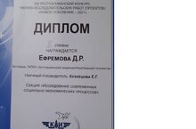 Ефремова Динара, студентка третьего курса (преп. Е.Г.Кузнецова) заняла второе место в Республиканском конкурсе научно- исследовательских (проектов) "Новое поколение - 2021". Динара выступала в секции "Исследование современных социально- экономических процессов".