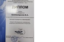 Во второй день Республиканского конкурса научно- исследовательских работ (проектов) "Новое поколение - 2021", Шаймарданов Владимир выступал в секции "Исследование современных социально- экономических процессов", где был удостоен диплома 1 степени (научный руководитель М.Г. Жакупова).