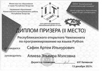 Студент группы 116И Сафин Артем, под руководством преподавателя Алиевой Эльвиры Мэлсовны, принял участие в Республиканском открытом чемпионате по программированию на языке Python и занял 2 место
