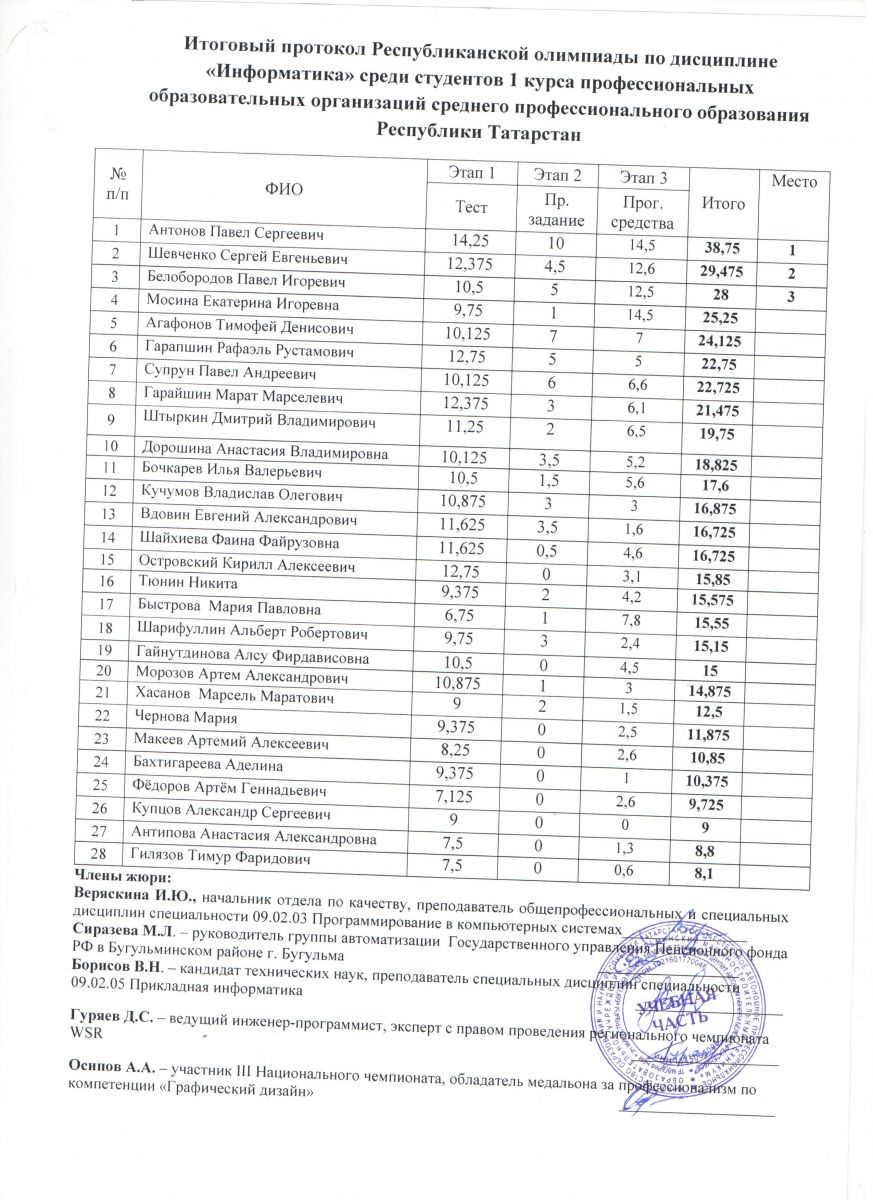 - Результаты Республиканской олимпиады по дисциплине "Информатика" среди студентов 1 курса ПОО СПО РТ 18.05.2018