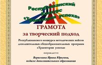 Грамота "За творческий подход" в Республиканском конкурсе методических кейсов дополнительных общеобразовательных программ "Траектория успеха"