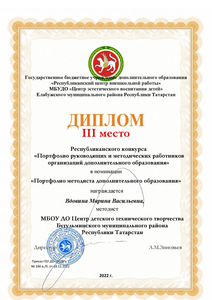 2. Республиканский конкурс "Портфолио руководящих и методических работников организаций дополнительного образования", номинация "Портфолио методиста дополнительного образования" Диплом 3 место