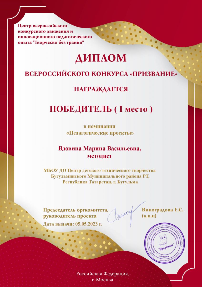 6. Всероссийский конкурс "Призвание", номинация "Педагогические проекты" Диплом 1 место (методист)