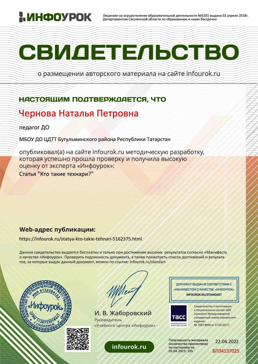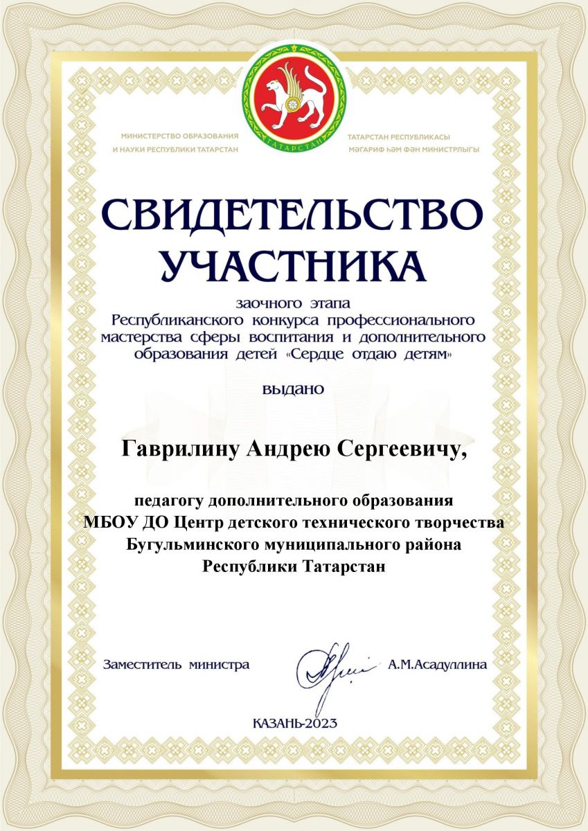 7. Республиканский конкурс профессионального мастерства сферы воспитания и дополнительного образования детей "Сердце отдаю детям": муниципальный этап, номинация "Педагог дополнительного образования по технической направленности" 1 место, Республиканский заочный этап Свидетельство участника