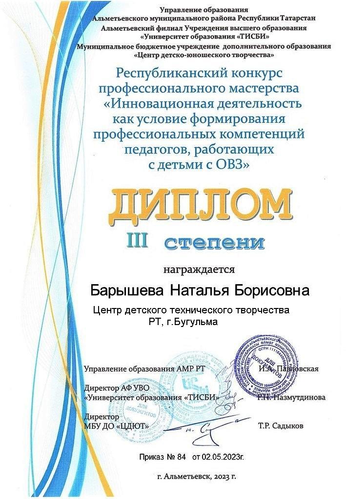 8. Республиканский конкурс профессионального мастерства "Инновационная деятельность как условие формирования профессиональных компетенций педагогов, работающих с детьми с ОВЗ"Диплом III степени
