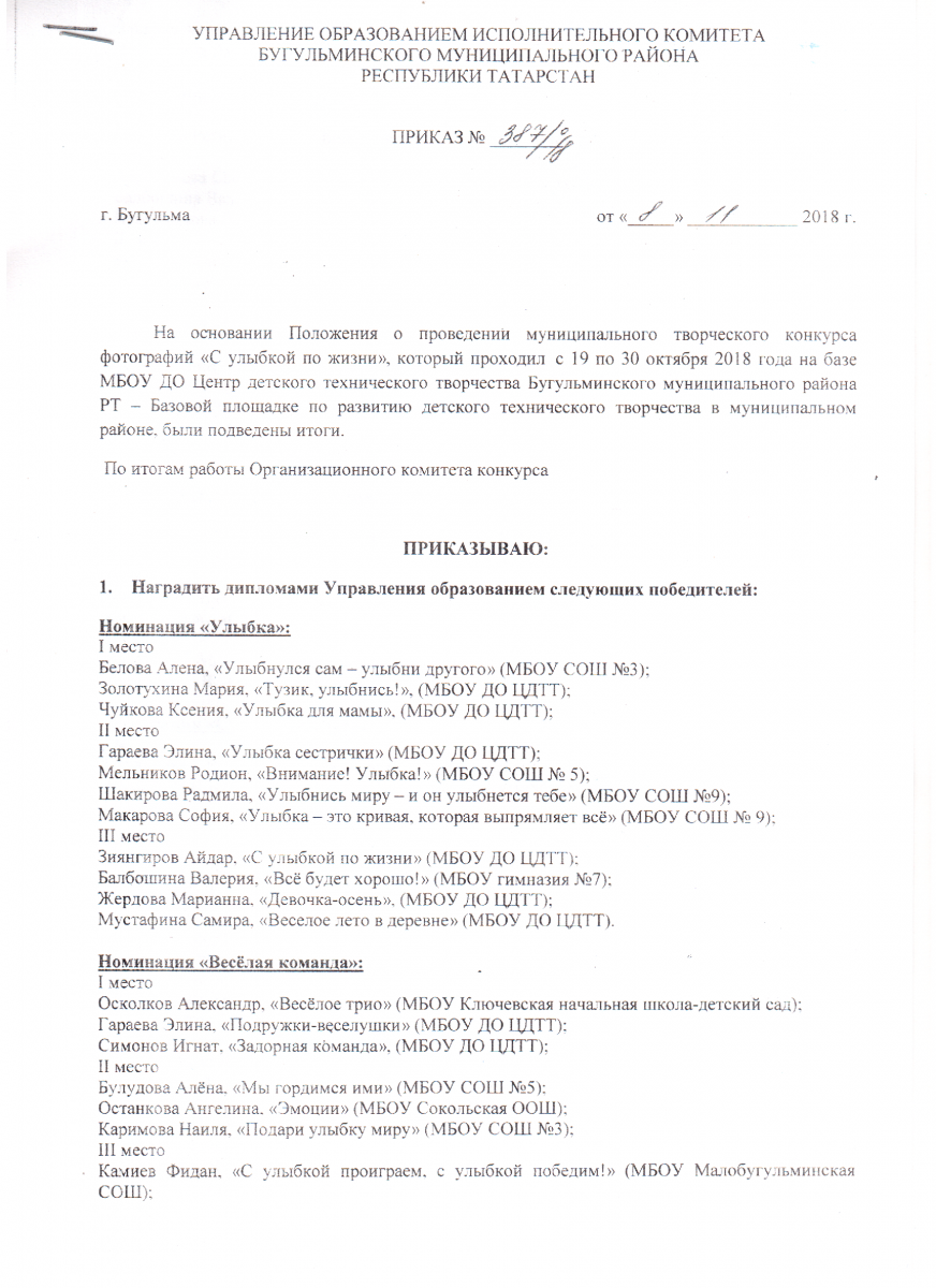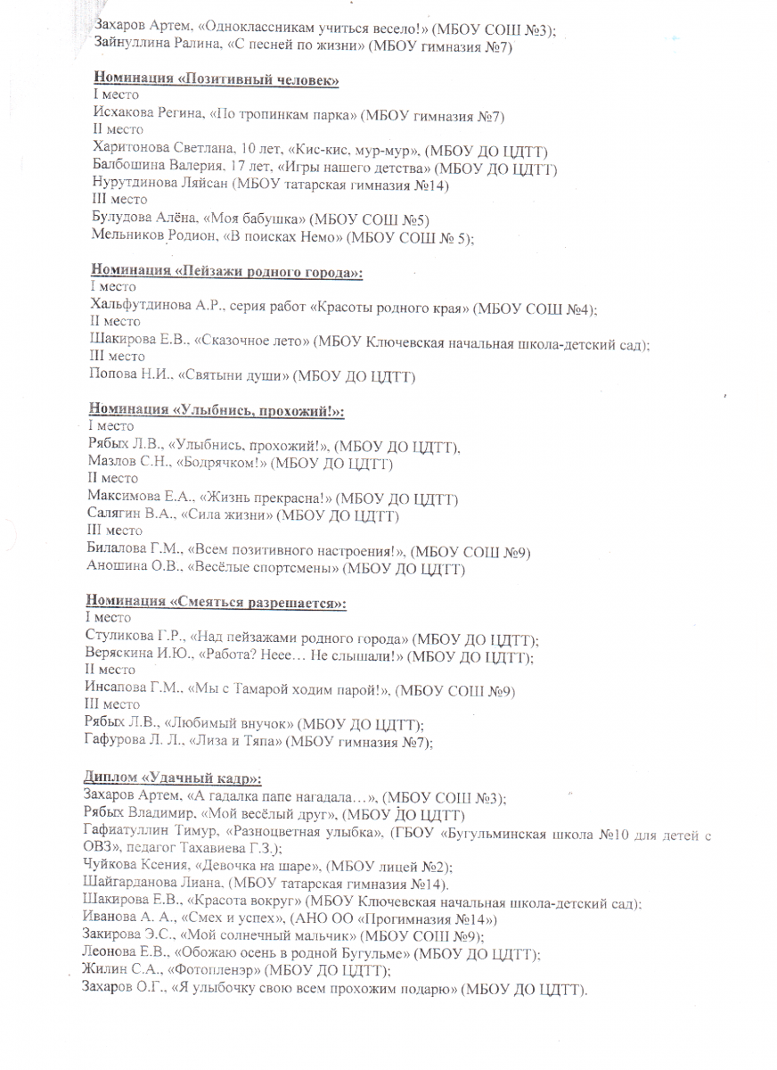 Опубликовано: 01.11.2018Подведены итоги муниципального фотоконкурса "С улыбкой по жизни!", который проходил на базе МБОУ ДО ЦДТТ с 19 по 30 октября 2018 г. С Приказом Управления образованием о награждении победителей Конкурса и участников можно ознакомиться здесь: /upload/storage/org649/files/Приказ об итогах 1стр(1).png /upload/storage/org649/files/Приказ об итогах 2стр(1).png /upload/storage/org649/files/Приказ об итогах 3 стр(2).png