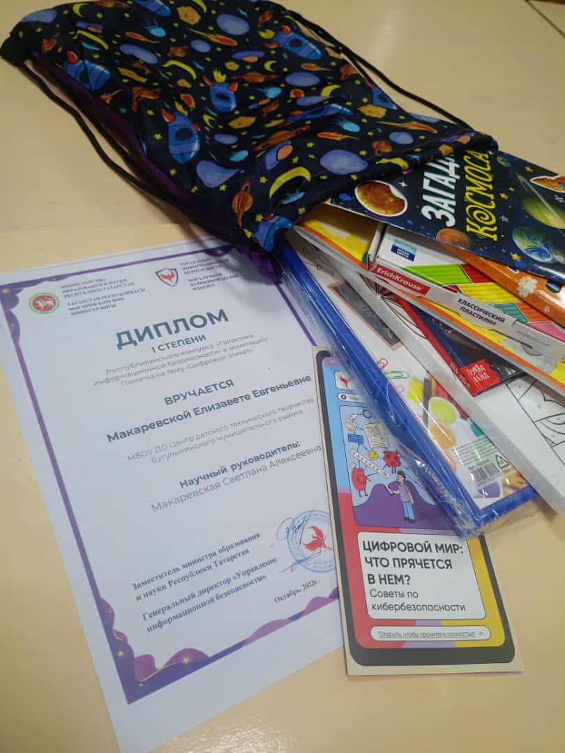 Опубликовано: 17.11.2023С 1 по 30 октября прошел Республиканский конкурс «Галактика информационной безопасности». В номинации: памятка на тему «Цифровой этикет», обучающийся нашего детского Центра, Макаревская Елизавета, получила диплом I степени, руководитель Макаревская Светлана Алексеевна. Спасибо за подарки и организацию конкурса. Желаем дальнейших побед!