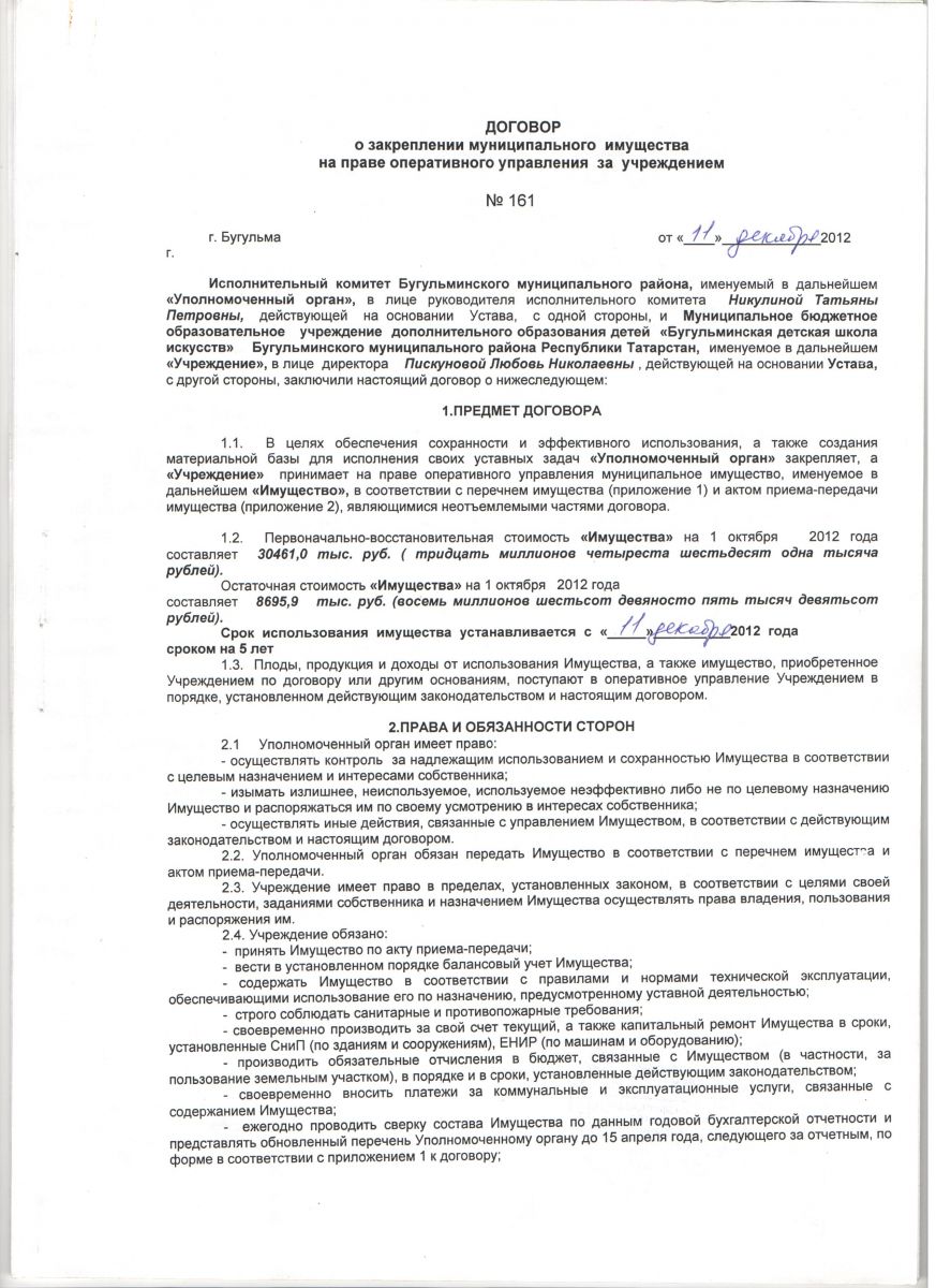 Договор о закреплении муниципального имущества на праве оперативного управления