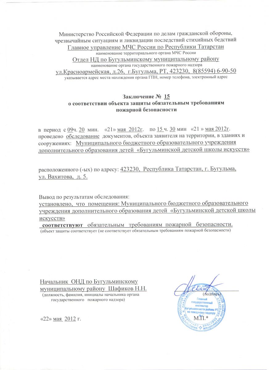 Заключение о соответствии обьекта защиты обязательным требованиям пожарной безопасности