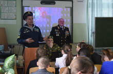 Юрий Дмитриевич, участник вооруженных конфликтов в Таджикистане и контртеррористической операции в Чеченской Республике, познакомил учащихся с историей создания и развития пограничных войск, привел примеры героизма пограничников на острове Даманском, в Афганистане и Таджикистане на 12 погранзаставе Московского пограничного отряда. Анатолий Константинович рассказал о службе в морских частях пограничных войск в Новороссийске, а Андрей Николаевич - о службе в маневренной группе пограничных войск на Дальнем Востоке и Прибалтике. В конце урока ребятам были продемонстрированы учебная граната, корабельный гюйс и правила вязания морских узлов.