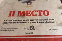 24-25 марта сотоялся Республиканский финал Всероссийской военно-спортивной игры "Победа - 2021". В состав сборной команды города Бугульмы вошел ученик 9 класса нашей школы Шаркаев Айдар. В личном первенстве Айдар стал абсолютным победителем в конкурсе "Одевание противогаза" и занял второе место в конкурсе "Челночный бег 10*10". В общекомандном зачете республиканского этапа Всероссийской военно-спортивной игры "Победа" команда заняла 2 место. Поздравляем Айдара и его руководителя - учителя ОБЖ Тихонова О.И. с высокими результатами, в дальнейшем желаем таких же ярких, уверенных и достойных выступлений!