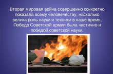В беседах сегодня ребята узнали, какую роль сыграли ученые, в частности, ученые-химики для приближения великой победы.Вторая мировая война совершенно конкретно показала всему человечеству, насколько велика роль науки и техники в наше время. Победа красной армии была частично и победой советской науки.