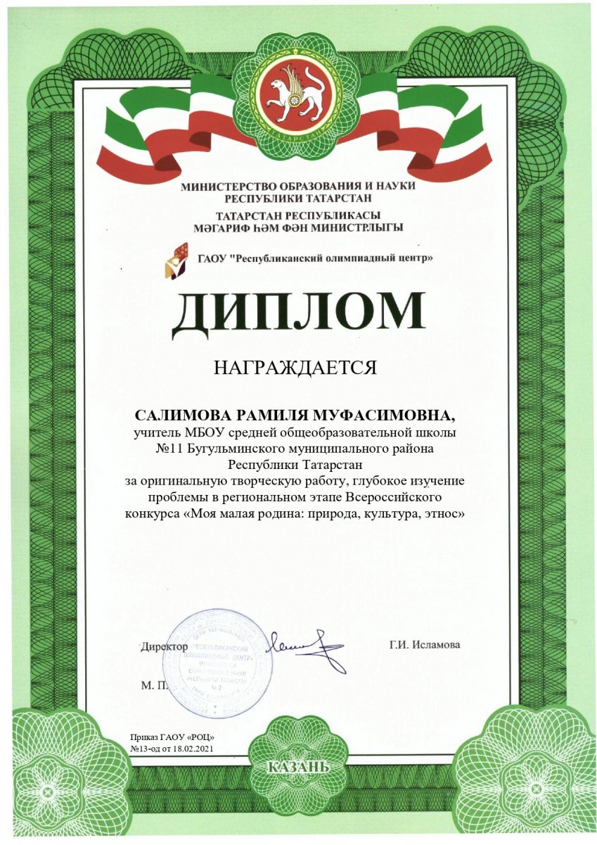 Салимова Рамиля Муфасимовна, учитель истории МБОУ СОШ №11, приняла участие в региональном этапе Всероссийского конкурса "Моя малая родина: природа, культура, этнос" и за оригинальную творческую работу, глубокое изучение проблемы была награждена дипломом. -