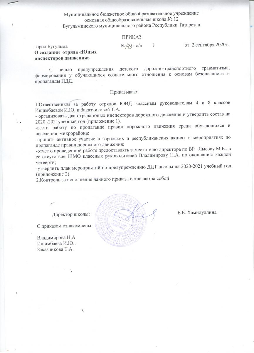 Приказ о создании отряда ЮИД и назначении руководителя отряда ЮИД