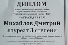 Прошёл Всероссийский конкурс научно-технического творчества " Юные техники 21 века" , где учащийся нашей школы №12 стал лауреатом 3 степени и получил диплом в номинации "Программирование и вычислительная техника".
