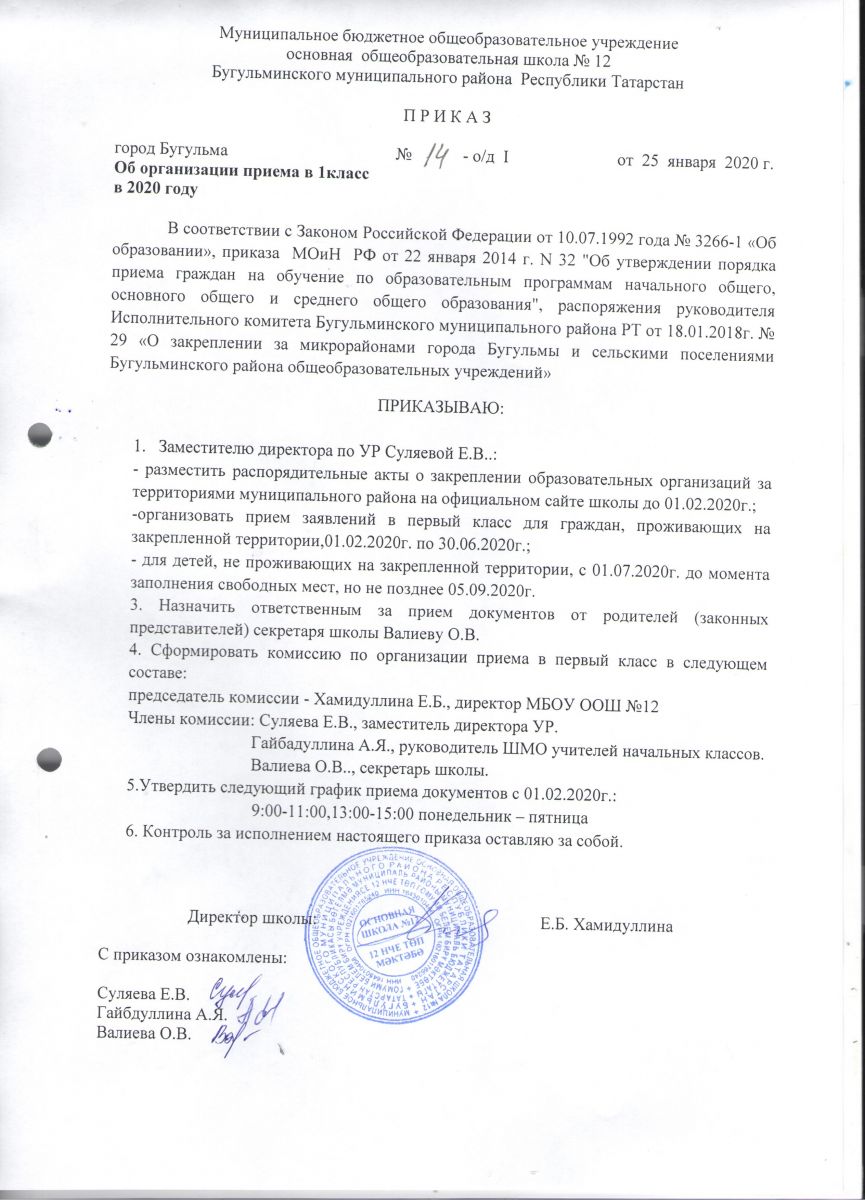 Приказ "Об организации приёма в 1 класс в 2020 году