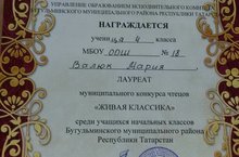 Поздравляем лауреата муниципального конкурса чтецов "Живая классика" среди учащихся начальных классов.