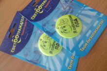 Световозвращающий значок изготавливается из пластика, на который наносится световозвращающий элемент. Крепится значок на безопасную булавку со скрытым острием. Значки можно крепить на одежду, на рюкзак, сумку и так далее.