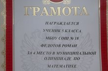 Ученика 5 класса Федотова Романа,занявшего 4 место в муниципальной олимпиаде по математике.