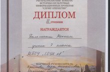 Поздравляем ученика 7 класса Бельмескина Максима с победой в Республиканском конкурсе историко-культурных информационных проектов "Служу Отечеству". Конкурс проходил в Средней общеобразовательной школе №78 Приволжского района г. Казани. Максим достойно представил проект "Я помню! Я горжусь!"(научный руководитель - учитель технологии Храмова Вера Михайловна; консультант - директор школьного музея "Истоки" Маханько Ольга Николаевна). Поздравляем и желаем дальнейших побед!