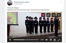 Лидеры кадетского самоуправления вместе с педагогом дополнительного образования Шаровой В.М. поздравили пользователей социальной сети VK с наступающим праздником Победы. В группе «Бугульминские кадеты» разместили видеоролик с нарезками патриотических песен в исполнении кадет, созданный из видеоматериалов школьного архива.