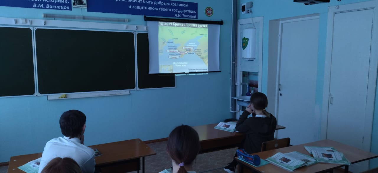 15 марта 2022 года с целью развития чувства патриотизма и гордости за свою страну, формирования Российской гражданской и цивилизационно-культурной идентичности школьников на основе исторических событий в 1-9 классах нашей школы прошли классные часы: "Крым и Россия – общая судьба", "Крым – путь домой", "Крым - моя история", "Мы вместе! Крым и Россия!", посвящённые воссоединению России и Крыма. 2022 нче елның 15 нче мартында патриотизм һәм үз илең өчен горурлык хисен үстерү, тарихи вакыйгалар нигезендә укучыларның Россия гражданлык һәм цивилизацияле-мәдәни тәңгәллеген формалаштыру максатыннан мәктәбебезнең 1-9 нчы сыйныфларында "Кырым һәм Россия-уртак язмыш», "Кырым – өйгә юл", "Кырым - минем тарихым", "Без бергә! Кырым һәм Россия!". Укучылар Кырымның Россиягә кушылуына каршы булган вакыйгалар турында белделәр.