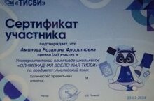 23 февраля Аминева Розалина, ученица 9 класса, приняла участие в Университетской олимпиаде школьников «ОЛИМПИАДНАЯ ВСЕЛЕННАЯ ТИСБИ» по предмету: Английский язык. Количество правильных ответов – 31. Поздравляем!