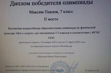 24 февраля Павлов Максим, ученик 7 класса принял участие во Всероссийской образовательной олимпиаде по физической культуре «Всё о спорте». Занял II место, награждён Дипломом победителя олимпиады. Поздравляем!