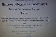 24 февраля Вотчинников Максим, ученик 7 класса принял участие во Всероссийской образовательной олимпиаде по физической культуре «Всё о спорте». Занял II место, награждён Дипломом победителя олимпиады. Поздравляем!