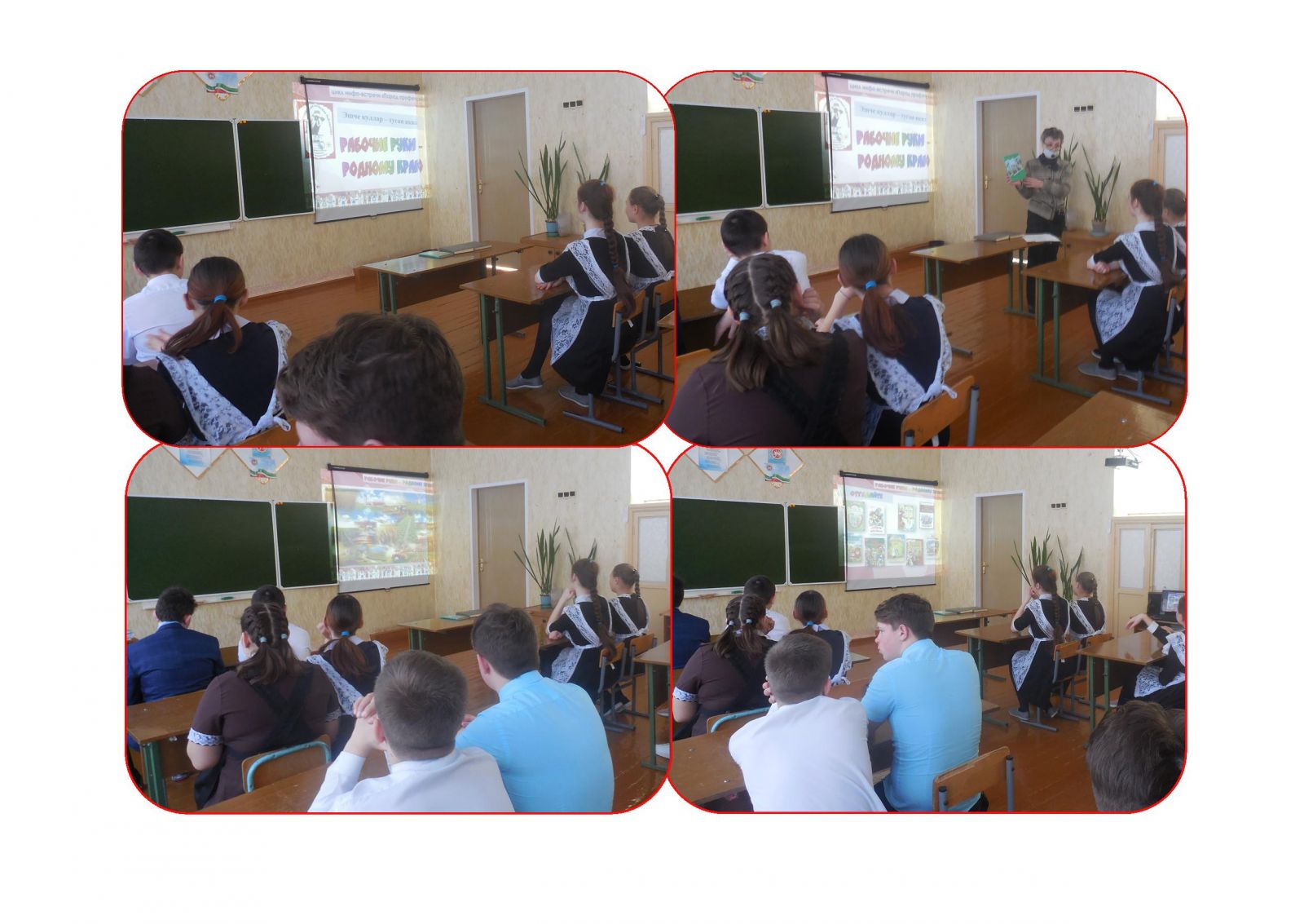 В рамках цикла инфо-встречи «Парад профессий» – «Һөнәр парады» сельский библиотекарь пригласила учеников 5-9 классов на слайд-обзор «Рабочие руки – родному краю». Они услышали рассказ о нужных на селе профессиях: агронома, механизатора, доярки, свинарки, птичницы. Кроме этого смогли пролистать книги с разъяснениями об особенностях рабочих профессий, буклеты с адресами учебных заведений, дающих профильное образование. В ходе обзора ученики участвовали в викторине «Я б рабочие пошёл…» и составляли пословицы о труде.