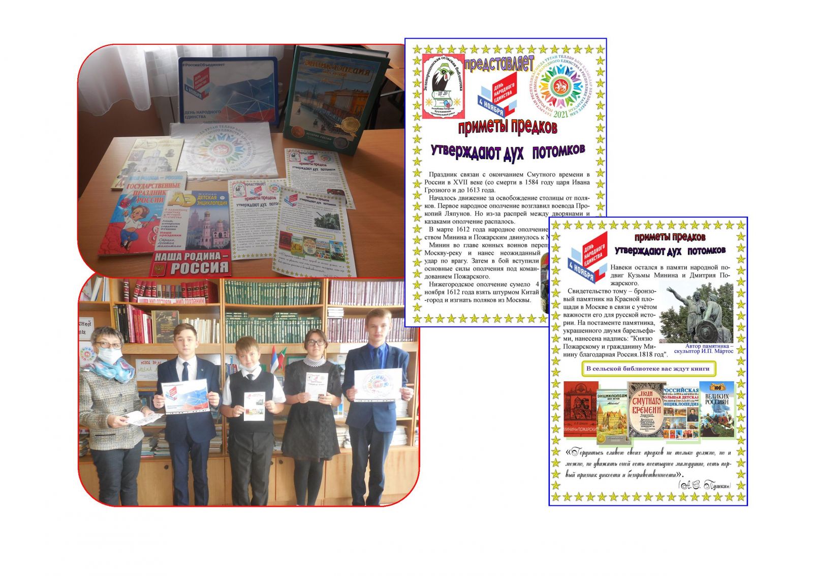 В рамках празднования Года родных языков и народного единства сельский библиотекарь распространила среди учеников 5-9 классов флаер «Приметы предков утверждают дух потомства» с рекомендательным списком книг ко Дню народного единства. Из листовки ребята узнали, какая литература поможет открыть исторические факты далеких событий 1612 года – года окончания Смутного времени, начала государственности и сохранения единства народа, а также о народных героях Минине и Пожарском.