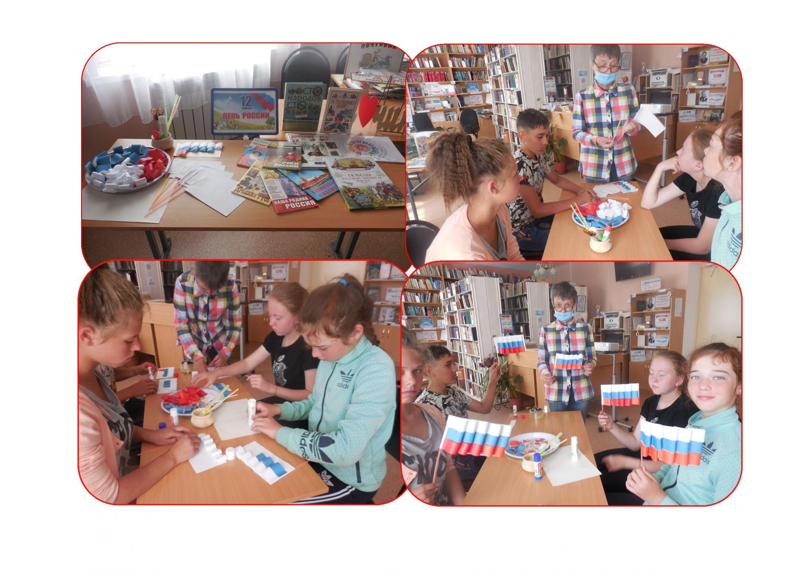 В рамках празднования Дня России сельский библиотекарь для учеников 4-6 классов подготовила путешествие-викторину «Красуйся, град Петров», посвященное 350-летию со дня рождения Петра I. Они познакомились с интересными фактами основания города Петербурга, из жизни русского императора и о том, какие государственные преобразования произошли в период его правления. Также отвечали на вопросы познавательной викторины и приняли участие в акции «Флаги России»: применяя знания аппликации и квилинга, смастерили из трех цветов бумаги российскийтриколор.
