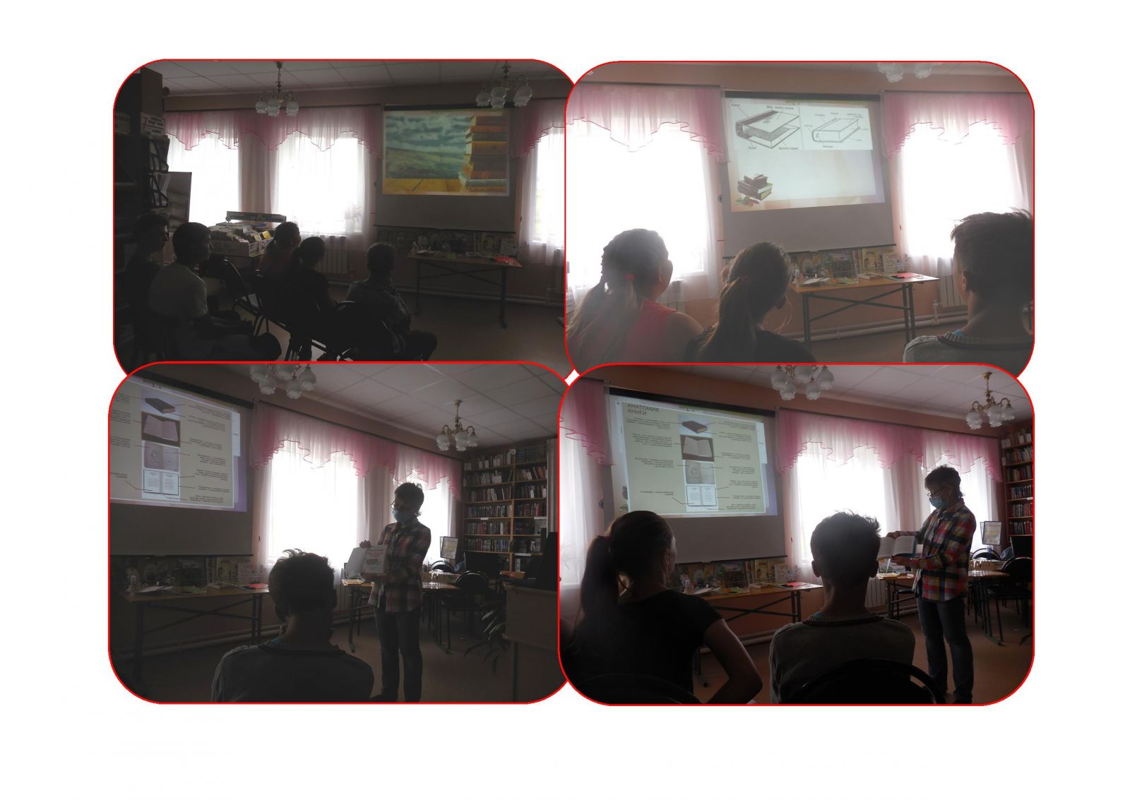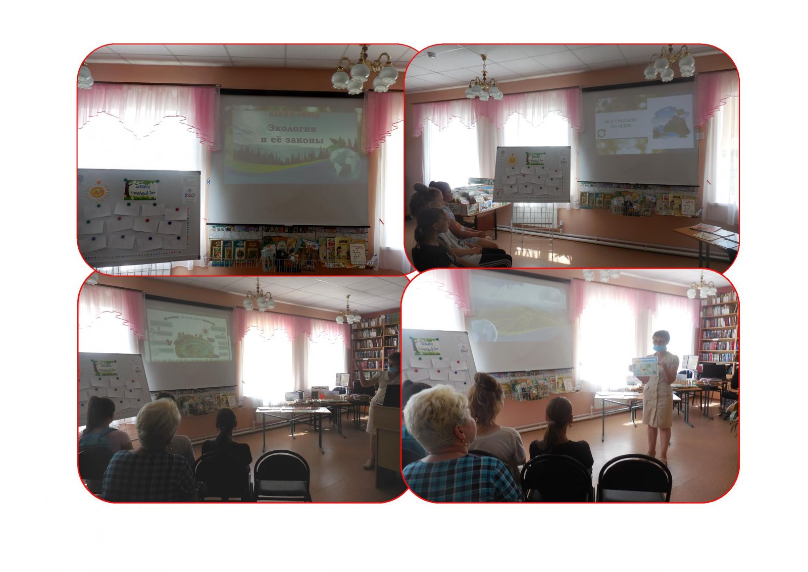 В сельской библиотеке учащимся школы был адресован слайд-обзор «Экология и её законы», где отмечалось, как прекрасен мир, который нас окружает. Сложно найти человека, который равнодушен к величественной красоте природы. Раскрывая фонд библиотеки, библиотекарь посредством книг старалась воспитать бережного отношения к окружающей среде жителей деревни, формировать их экологическую культуру. Было предложено ребятам разгадать эко-ребусы, ответить на вопросы викторины «И с пухом, и с пером». Во время слайд-обзора звучали фрагменты песен Ю.Антонова «Как прекрасен этот мир», «Живет повсюду красота», А.Пахмутовой «Просьба».