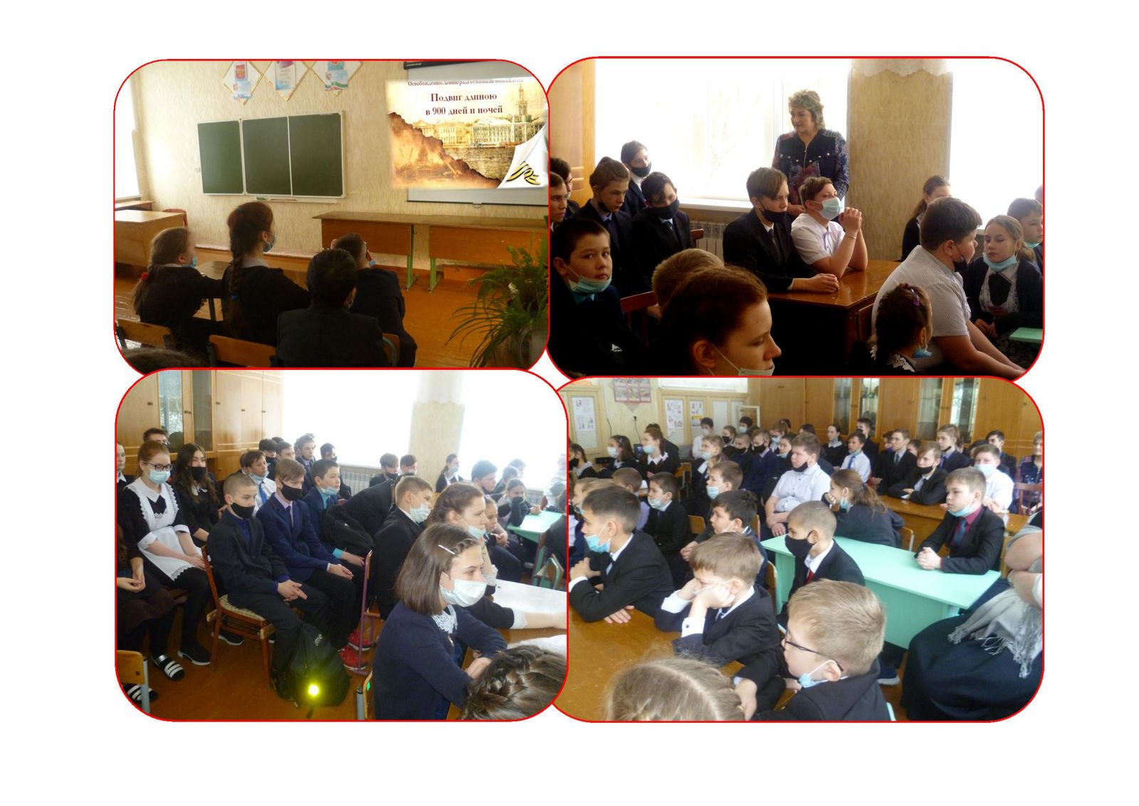 Для учащихся 5-9 классов была показана слайд-композиция, посвященная освобождению Ленинграда от блокады, которая продолжалась 900 дней и ночей (08.09.1941-27.01.1944г.г.). Ребята узнали, с какой целью немецкими войскамипроводилась изоляция города, а также о героическом подвиге самих ленинградцев и бойцов советской армии, защищавших город на Неве.