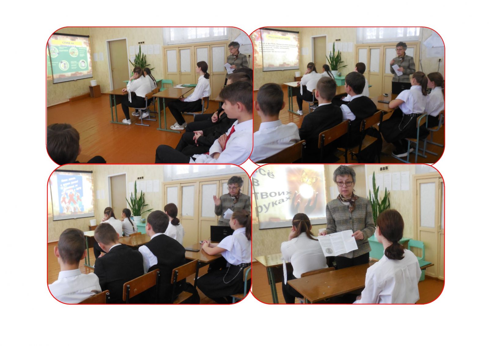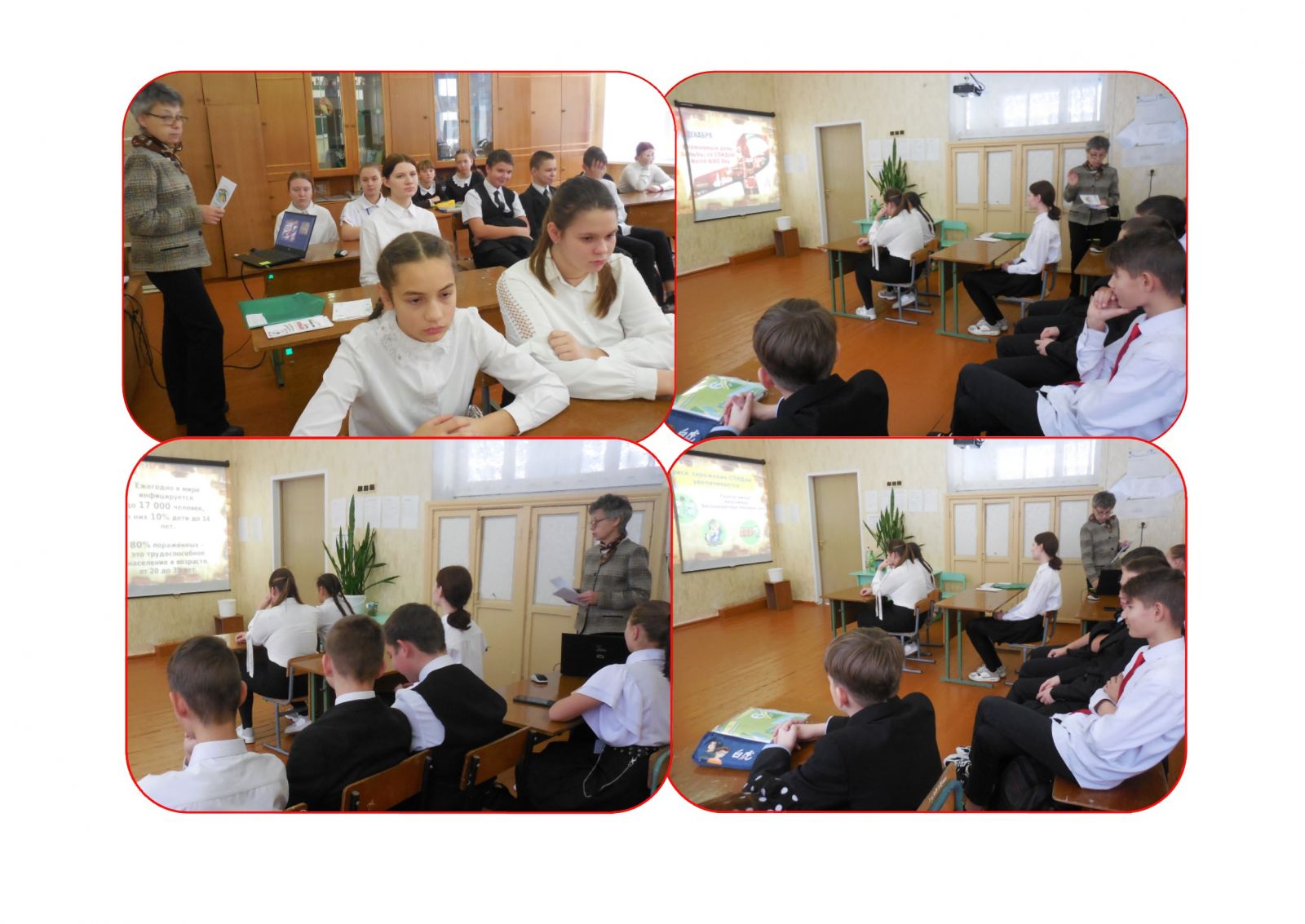 Сельский библиотекарь ознакомила учащихся 7-9 классов со статистикой заболевания, о путях передачи вируса, синдромах и группах риска, а также о символе борьбы со СПИДом: красная ленточка — это знак осведомленности, поддержки и солидарности с людьми, живущими с ВИЧ. Кроме этого, распространила красочные буклеты «Здоровому всё здорово». В розданных листовках ребята смогли найти информацию о том, как отказаться от вредных привычек и список книг о правилах ведения здорового образа жизни, с примерами сложных жизненных ситуаций известных артистов, музыкантов, общественных деятелей. Девизом акции распространения буклетов стали слова: «В ваших руках – здоровье, радость жизни и счастье».