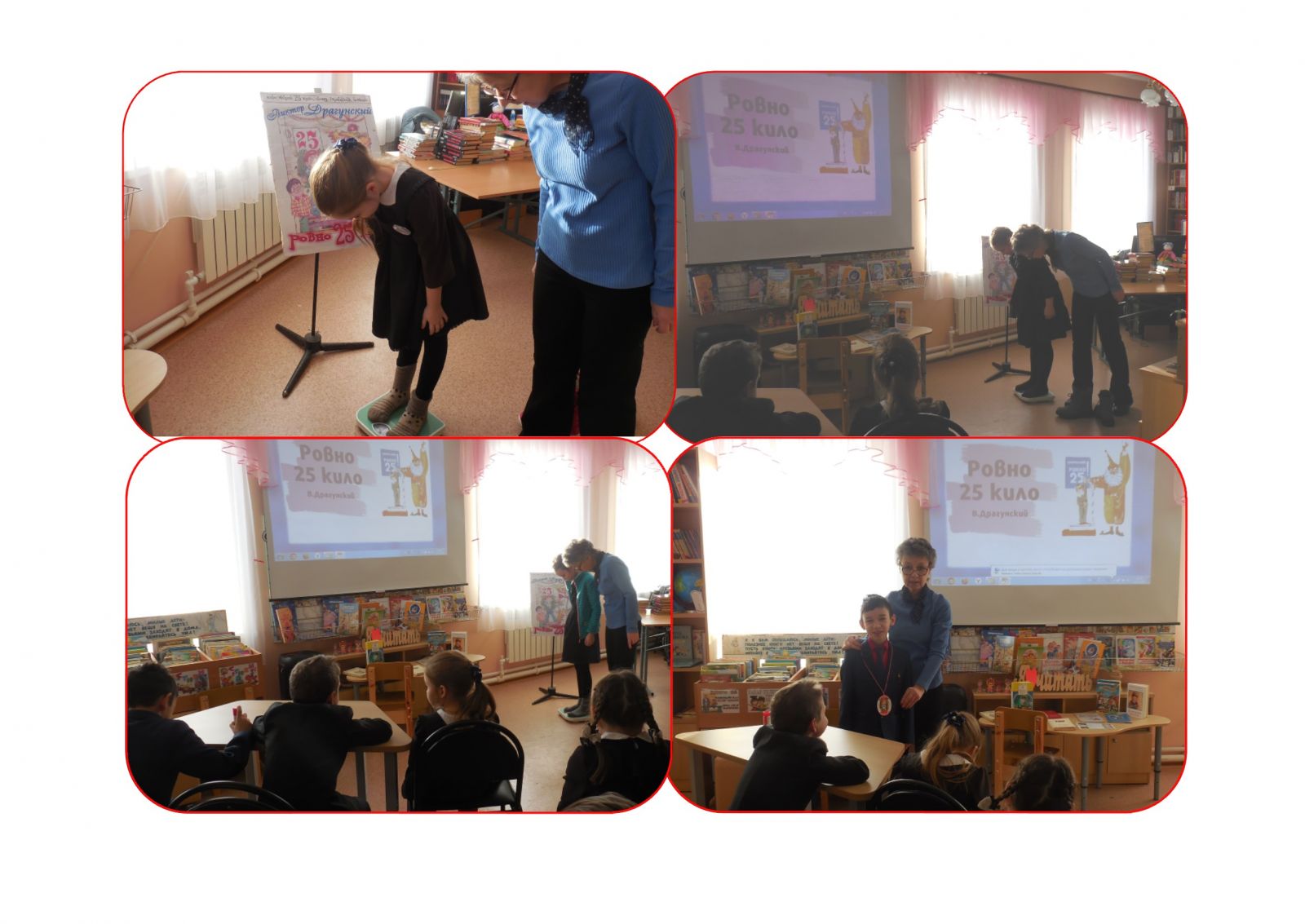 В сельской библиотеке для учеников 1-4 классов бы организован литературный круиз «По секрету всему свету» по произведениям писателя Виктора Драгунского. Ребята ознакомились с основными этапами жизни и творчества писателя, рассказ библиотекаря сопровождался слайдами, которые содержали познавательные, с необычайным стилем иллюстрации к книгам писателя. В заключение литературного круиза ребята с большим удовольствием листали страницы книг писателя, смотрели мультфильм «Ровно 25 кило» и участвовали в конкурсе: с помощью напольных весов определяли вес участников. Обладателю 25 кг была вручена медаль.