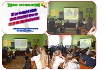 На познавательный литературно-музыкальный слайд-час «Хроника великого сражения», посвящённый 75-летию разгрома немцев под Сталинградом, сельский библиотекарь пригласилаучащихся 5-9 классов. Слово «Сталинград» вошло в словарный фонд всех языков мира и с той поры напоминает о битве, которая по размаху, напряжению и последствиям превзошла все вооруженные столкновения прошлых времен. Во время слайд-часа звучали стихи, песни о самой кровавой сухопутной битве во время Великой Отечественной войны, рекламировались литературные произведения: Е.Ильина «Четвертая высота», А.Василевский «Дело всей жизни», Ю.Бондарев «Горячий снег», Н.Яковлев «Маршал Жуков», сборник воспоминаний «Сталинград: уроки истории».