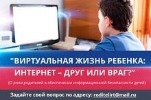 19.01.2018г. с 12.00 до 13.00 состоится Республиканское родительское интернет-собрание "Виртуальная жизнь ребёнка: интернет-друг или враг?"