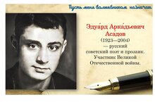 Библиотекарь сельской библиотеки предлагает ознакомиться учащихся и педагогов с информ-досье поэта Эдуарда Асадова. Вы сможете узнать интересные биографические факты поэта и о красоте его поэтического слова: благородстве, доброте, великодушии, верности, справедливости, патриотизме, любви, дружбе, нежности. Библиотекарь напоминает, что книги Э.Асадова имеются в фонде библиотеки.