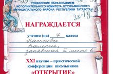 16 феврля в г. Бугульма прошла XXI научно-практическая конференция школьников «Открытие». Обучающаяся 7 класса Насонова Валерия выступила с работой Кто я? Что я? Только лишь мечтатель… под руководством учителя русского языка и литературы Мутагировой И.Ф. и заняла IIIместо. Мы поздравляем их с этой победой и желаем им дальнейших творческих успехов.