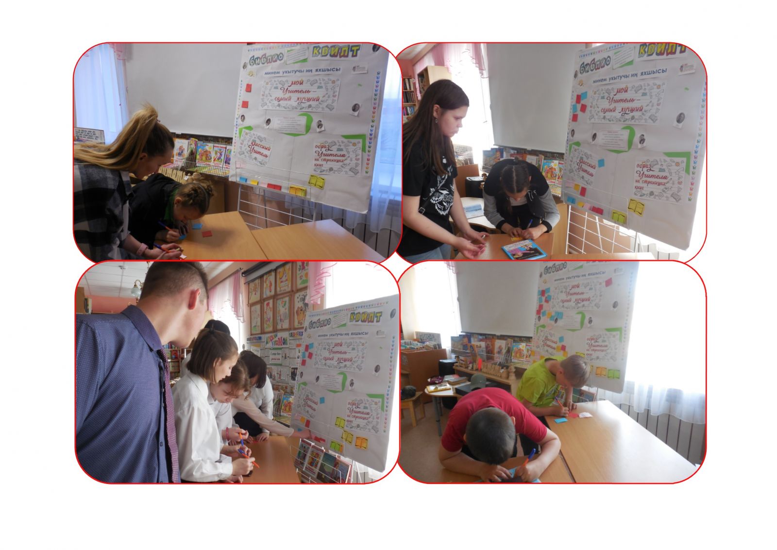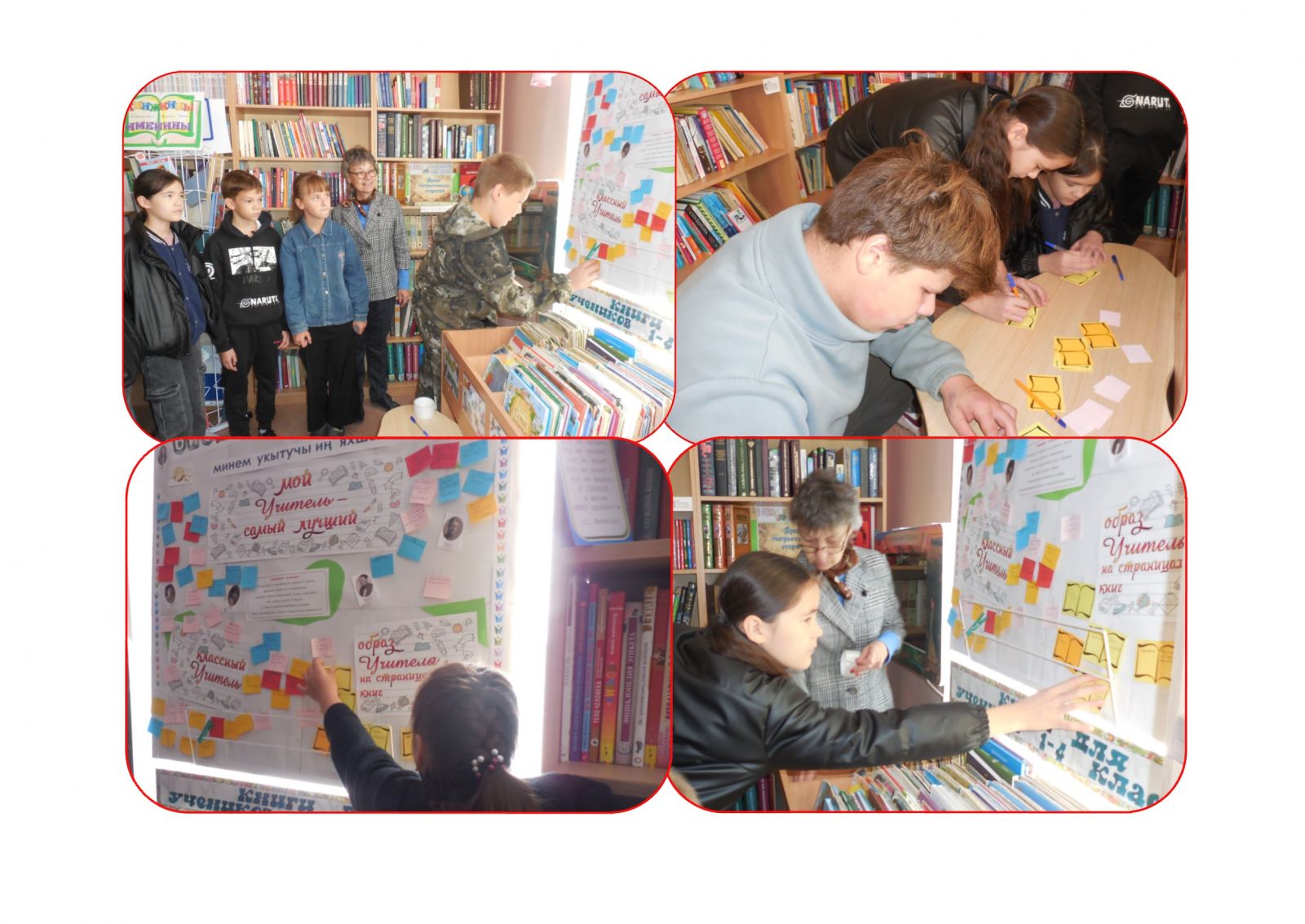 В сельской библиотеке в рамках празднования Года педагога и наставника для учащихся щколы был организован библиоквилт «Мой учитель самый лучший», который состоял из трех цветных частей: «Мой учитель – самый лучший», «Классный учитель», «Образ учителя на страницах книг». Ребятам было предложено внести к каждому блоку свой цветной «лоскуток» (стикер), написав на нём имя и фамилию своего наставника, учителя, названия книг о школе, учениках, педагогах. В результате получилось яркое полотно, отражающее образы учителя в произведениях писателей, а также слова любови и уважения к тем, от кого во многом зависят результаты обучения и воспитания, развитие в человеке доверия и нравственных ценностей.