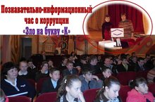 Коллективом дома культуры и сельским библиотекарем был организован информационно-познавательный час «Зло на букву К» для читателей 5-9 классов и педагогов с целью разъяснения сущности, причины, масштаб и последствий коррупции. Библиотекарь И.В.Ишкова обратила внимание на содержание понятие «коррупция», на её исторические корни, на то, что влечет она за собой и какие следуют наказания в УК РФ. Затем библиотекарь привела в пример литературные произведения, в которых обличается, высмеивается растрата, взятка, казнокрадство («Ревизор», «Мертвые души» Н. Гоголя). В заключение читатели поделились своим рассуждениями о коррупции и борьбе с ней, и пришли к единому мнению: нужно начать с самого себя и требовать устранение коррупционных проявлений от окружающих. Всем желающим были розданы буклеты «Твоё «НЕТ» имеет значение». На мероприятии главный редактор газеты «Бугульма авазы» Заляев Р.С.