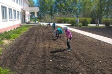 Укучылар мәктәп тирәсен чистартуны дәвам итәләр. Тирә-якны чүп-чардан арындыралар, чәчәк түтәлләре ясыйлар.
