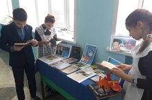 В рамках мероприятий, приуроченных к 60-летию полета Ю.А.Гагарина в космос в школе вместе с библиотекарем была организована книжная выставка, где поместились книги о космонавтах, рисунки и газетные материалы.