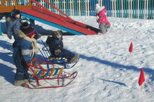 Игра - соревнование "Толкачи". По сигналу дети катят санки до флажка и обратно, держась за спинку санок.