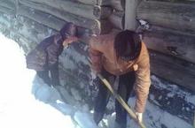 Скоро половодье... Тимуровцы очищают пришкольную территорию от снега.