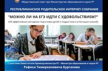 13 апреля 2018 года Министерство образования и науки Республики Татарстан совместно с Общественным советом при Министерстве образования и науки Республики Татарстан проводит на базе Казанского инновационного университета имени В.Г.Тимрясова пятое заседание Республиканского интернет - собрания по теме " Можно ли идти на экзамен с удовольствием?". Начало в 11ч.00 мин по ссылке https://ieml.ru/roditelskoe-internet-sobranie/